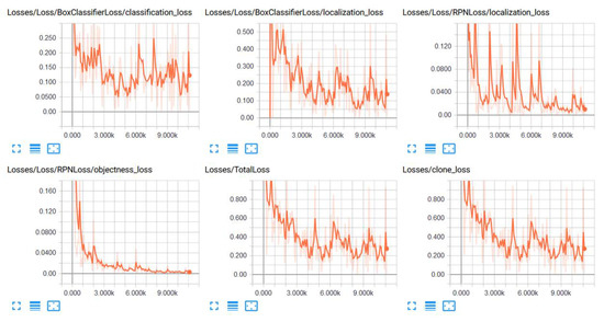 The TOD character detection model used on top of our character recognition model was built using Google object detection directory within the TensorFlow repository. The example of TOD Segmentation is shown in Figure 3c. Figure 5 illustrates the loss over a 10,000-iteration period for training this character detection model. We can view the loss rate upon training when we gave the same data received from our generator to our training model. The data give the detailed information such as where the character lies within the image and the label it has. In Figure 5, classification loss is the loss between the detection and a set of characters since it does not classify individual characters; localization loss is the loss of wrapping box around the character and its real location; RPN loss is the loss of combining the previous classification and localization losses; objectness loss is the loss of classification based on the bounding boxes; total loss is the total loss between classification, localization, RPN localization, and objectness losses; clone loss is the same as the total loss. In this project, we used the model generated from 10,000 iterations because the higher iterations can cause overfitting.