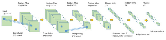 First a constant input must be set in place for the network. A decided fix input size of a pixel image was used, which allows the previous images generated to be segmented and reduced down to a size. Being our input layer, the data passed in must be of dynamic nature and not all statically the same for our model to score effectively towards it. Using a Multi-Layer-Perceptron (MLP) rather than a Single-Layer-Perceptron (SLP) boosts the performance compared with the same scheme presented in [4]. Using this as a main basis of what to construct for our network, a Convolutional Neural Network model was built as shown in Figure 6. We adopted the batch size of 128, epoch of 40, and drop out rate of 0.2 [26]. The cross-entropy loss function is described in the generalized Equation (1),