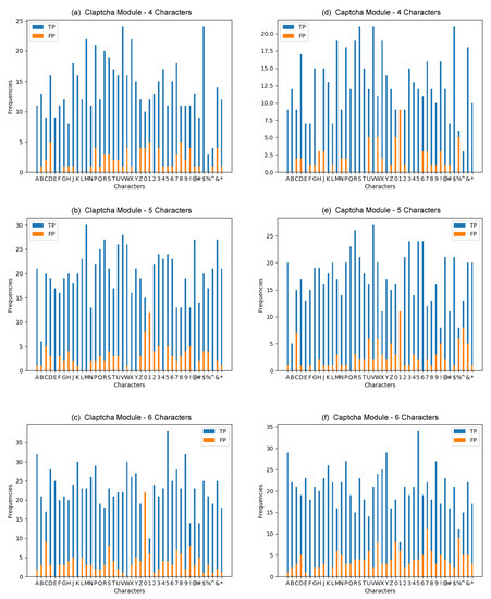 Figure 8 shows evaluation results for our conjoined method which display vital information for key aspects needed in cracking CAPTCHAs. We notated the proposed method as TOD+CNN that means TOD for segmentation and CNN for character recognition. Also, we compared TOD+CNN with Peak+CNN (peak segmentation and CNN) since this project is the first work on cracking the open-source Python CAPTCHA data set and there is no other existing results that could be used for comparison. Figure 9 gives the results of the true/false positives over the character-level accuracy. It becomes apparent in Figure 8 and Figure 9 that we can take away a few key aspects: (1) Increasing character length tends to cause degradation in cracking CAPTCHAs. (2) TensorFlow Object Detection outperformed the Peak Segmentation framework. (3) There is no clear character(s) that are consistently misclassified by our model.