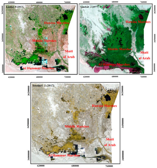 Landsat has recently been used to undertake long term monitoring of surface water bodies at global and regional scales [12]. Landsat-8 acquires global moderate-resolution measurements of the Earth’s surface in the visible (VIS), near-infrared (NIR), short wave infrared (SWIR) and thermal infrared (IR) [13]. The Sentinel 2A satellite was successfully launched on 23 June 2015, as part of the European Copernicus program. Sentinel 2 carries an innovative wide-swath, high-resolution (up to 10 m for four spectral bands), multispectral imager (MSI) with 13 spectral bands; this is going to offer unprecedented perspectives on our land and vegetation [14]. Many studies have dealt with the use of Landsat in the study and monitoring of marshes and wetlands. Abdul Jabbar et al. [15] used Landsat images in three different intervals: MSS in 1973, TM in 1990 and ETM in 2000. These were used in the change detection method and in calculating the normalized difference vegetation index (NDVI) to recognize the vegetation cover and determined as a percentage from the total coverage area of the marshes. The results have shown there are large changes that took place between 1973 and 2000 in land cover and land use. The barren land increased; while the water bodies decreased drastically. The work of Amani et al. [16] deals with the spectral characteristics of five wetland types, including bog, fen, marsh, swamp, and shallow water, in a pilot site in Newfoundland were analyzed. This study used the data acquired by the two satellites, Sentinel-2A and Landsat-8. According to the analyses, the best spectral bands for wetlands’ discrimination and classification were selected. Then, the optimum bands were inserted into an object-based Random Forest algorithm to classify wetlands in the study area. The overall classification accuracy was 84% with a Kappa Coefficient of 0.77.