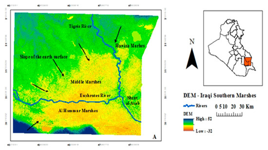 The marshes spread the swamps in the south of the sedimentary plain of Iraq, are as a triangle; the urban areas of Amara, Nassirya, and Basra are situated on their heads, (Figure 1). The most important of these marshes are Hawiza Marsh, which intersects with the Iranian border, the central marshes between two provinces Misan and Thi Qar, and Hammar Marsh, which lies south of the central marshes on the Euphrates river. The marshes are located in a basin area, where the lands descend from different directions. The land in the marshland is quite flat and low at the same time, but the height of the area does not exceed 2.5 m, above the sea level, and the rise in sea level is in Hammar Marsh. The marshes are located in the subtropical zone, which is characterized by a hot, humid climate in summer and cold in the winter with precipitation. The maximum temperature in summer ranges between 35–50 °C and in January it reaches 0 °C [17]. In the winter, the area is subject to low pressure, causing winds from the northeast. In the summer, northwestern wind blow over the marshes. During the last decade of the 20th century, there was a clear increase in temperature and low relative humidity. Drying the marshes negatively affected the climate of the region. As a result of high temperatures, atmospheric pressure decreases and wind speed increases in the region. The lower relative humidity in the air was due to the receding of the marshes, which is the main source of air supply with water vapor. The rising dust phenomenon in the marshes has also increased as a result of the drought of a large area of land, which was immersed in water [18].