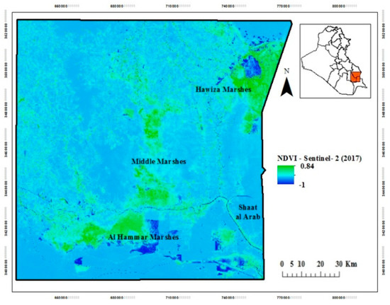 ArcGIS 10.4.1 was used to calculate the NDVI values for the three satellite images of the southern Iraqi Marshes for 1977 and 2017, Figure 4. The NDVI values of Landsat 2 images in 1977 were large. The areas of green color in the landscape were wide and extended on a large area within the marshes and on their borders. They represent the natural and agricultural vegetation, and their value ranges from 0 to +1. While the blue color represents the water bodies of the marshes at that time, and their values are less than 0. The 10 m resolution of Sentinel 2 was more accurate in showing vegetation and water for NDVI values than in Landsat 8 in 2017, although the two images were captured at about the same time. The reason was the range of NDVI in Sentinel 2 image ranges between (−1 to 0.84). This allows for slight changes in the difference between R and IR bands, and showing vegetation areas, shallow and deep-water levels in it, compared to Landsat-8 image, in which the value of NDVI ranged from (−0.27 to 0.57). When comparing the NDVI values between 1977 and 2017, observe the deterioration of the vegetation cover and water bodies in the marshes. Large areas of natural vegetation and agricultural land have disappeared, and have been replaced by dry arid lands.
