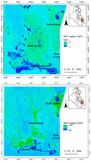 The results of the NDVI calculation of the Iraqi southern marshes for the years 1977 and 2017, showed the deterioration of vegetation cover and water bodies in it. Large areas of natural vegetation and agricultural land disappeared and were replaced by dry barren lands. The drying processes are not solely responsible for the deterioration of the ecosystem of the marshes. Several factors have contributed to this deterioration over the years, including the poor water management of the marshes. Also, the marshes have been affected by climate change, as a result of the increase of an annual average of maximum temperature, accompanied by a decrease in the amount of precipitation. However, satellite data can be used in the periodic monitoring of marshes and water bodies, because it has high potential to detect changes that have occurred. It is important to develop plans to improve the development of the marshes, and to restore them to what they were, because the marshes are very important environmentally and economically to Iraq.