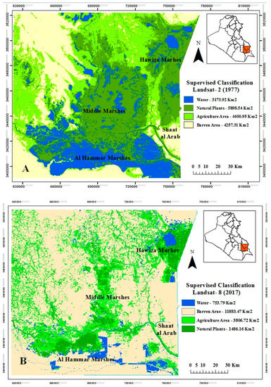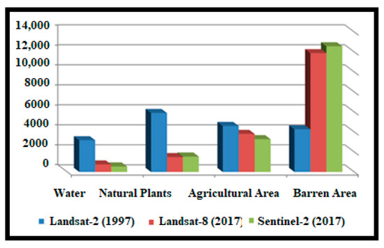 Displaying the results of the supervised classification for images of three satellites to southern marshes for 1977 and 2017, Figure 5 showed the large variation in the area of the water bodies and the vegetation within 40 years. The area of water bodies in the image of Landsat 2 in 1977, Figure 5A was 3173.92 km2, especially the large expansion for Hammar Marsh. While the area of natural plants reached to 5898.54 km2, it represented the biggest area within the Hawiza and central marshes. The agricultural areas were centered around Hawiza, and the central marshes were 4600.95 km2, on branches of Tigris River in Misan province and branches of Euphrates River within Thi Qar province. The barren area reached to 4257.31 km2 in 1977. Note from Figure 5B illustrates the supervised classification of Landsat 8, that the area of water bodies in marshes has shrunk in 2017 to 753.79 km2, converted to a barren area. As well as, area of natural plants shrinks to 1486.16 km2, agriculture areas to 3806.72 km2. In other hands, the area of barren lands increased to 11,883.47 km2 compared to 1977. For comparison with the image of Landsat 8, the results of supervised classification to Sentinel 2 in 2017, Figure 5C, showed that water area was 544.62 km2, and the agriculture area reached to 3275.38 km2, less than their values in Landsat-8. Meanwhile the area of the natural plant was 1539.86 km2 and barren areas were 12,596.24 km2. The difference in areas of land cover and land use between the images of Landsat-8 and Sentinel 2 came back to clear contrast in the recorded spectral reflectivity for land surface classes (water, natural plant, agriculture and barren lands) in the marshes region, especially within the spectral bands Red Edge 5, 6, 7, 8A, NIR 8 and 9 in Sentinel 2. These bands are useful for moisture land mapping and provide information to vegetation and water monitoring for marshes. There are also the spectral bands SWIR 11 and 12, in Sentinel 2, that corresponding to SWIR 6 and 7 bands in Landsat 8, Table 1. The bands SWIR 11 and SWIR 6 to distinguish water bodies, compared to SWIR 12 and SWIR 7, due to its sensitivity for plants and soil moisture content. While the thermal bands 10 and 11 are in Landsat-8 only, they are used to distinguish shallow water areas. Therefore, the area of water bodies in the image of Landsat 8 bigger than in Sentinel 2, although the two images were taken in the same year. Figure 6 shows a comparison between areas of land cover classes in Iraqi southern marshes for three satellite images in 1977 and 2017. The decreases in water, agricultural lands and natural plants conversely lead to increases in barren areas during 1977–2017. The drying up of marshes since the 1980s and conversion to barren area, destroying the unique ecosystem of marshes, represented bigger environmental disaster, changed features of life and nature in it, which led to a large migration of its residents and neighboring villages. High temperature and evaporation rates accompanied low water revenues of the marshes, as well as decreased precipitation. All these reasons have affected the environment of the marshes and their areas and changed their environment significantly. Despite an inundation of the marshes by water, it has not reached half of its previous area in the 1970s.