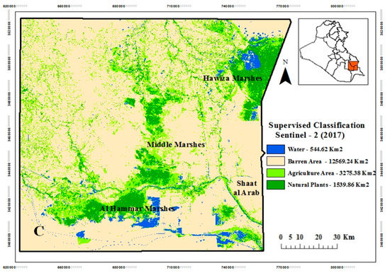 Supervised classification for Iraqi southern marshes: (A) Landsat 2 in 1977, (B) Landsat 8 in 2017 and (C) Sentinel 2 2017.