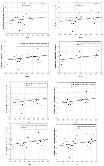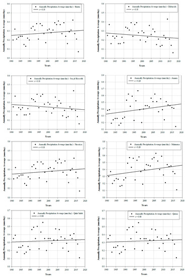The drying processes are not solely responsible for the deterioration of the ecosystem of the marshes. There are many factors which have contributed to this deterioration over the years, including the poor water management of the marshes after the re-inundation, and, affecting Iraq and the marshes in particular, global climate change. This is evident in the change in the annual maximum temperature averages and precipitation, Figure 7, which shows the annual maximum temperature average in the period of 1981–2016, for some cities in the area of the marshes in southern Iraq (Chibayish, Shatra, Amara, Souq al Shoyokh, Maimona, Nasseriya, Qurna and Qalat Saleh). Figure 8 illustrates the annual precipitation average for the same time period and sites. The above two figures show that there has been a clear change in the maximum temperature that has risen in all sites, indicating that the marshes are affected by climate change. The trend line in marshes for the last 40 years shows a weak decrease in precipitation only in 2 cases of 8 stations; but in all cases, recent years were very dry, which has had a significant impact on Iraq’s available water imports and reduced water supply to the marshes.