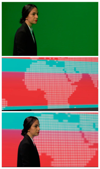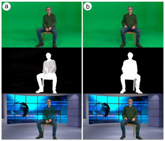 Chroma-keying process. Original images (top), chroma-keying mask (middle) and final composite image (bottom). Incorrect keying threshold configuration result (a). Proper chroma-keying configuration result (b).