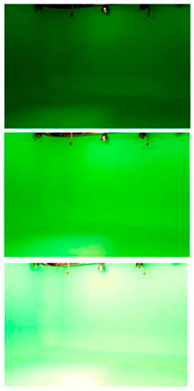 The study was developed in a virtual TV set at the Faculty of Communication Sciences of the University of Santiago de Compostela (Spain). The set has a green cyclorama of 5.10 m wide by 3.3-m long and 3-m high surrounding a manually illuminated acting area. At the beginning of the test process the cyclorama lighting presented several visible artifacts due to time and usage since their last calibration. As it has been previously mentioned, the first set of tests focused on correcting these artifacts.