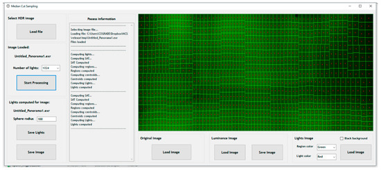 The second step is the image processing. The panoramic HDR image is processed using custom software, the cyclorama illumination analyzer (CYIA). This application was developed using C++, making use of OpenCV [29] to handle the HDR images and Windows Forms for the visual user interface. This tool includes different options to configure the processing and the results obtained such as the number of regions in which the image will be subdivided, or the colors used in the visual results. It also includes a visualization area to check the resulting images (Figure 5).