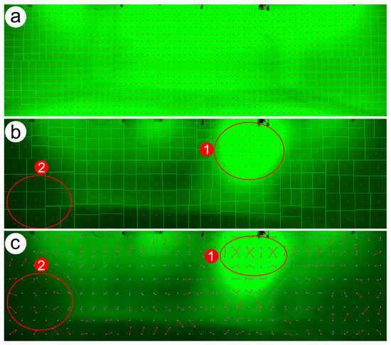 Correctly illuminated cyclorama subdivided in 1024 regions. All the regions have a similar size and the centroids tend to be located in their geometric center (a). Image subdivided in 256 regions. In the “1” area, which is over-lighted the regions are smaller than in the “2” area, which is shadowed (b). Image subdivided in 256 regions. In the “1” area, which is over-lighted, each ideal centroid has two or more real centroid correspondences. In the “2” area, which is shadowed, there are several ideal centroids which have no real correspondent (c).