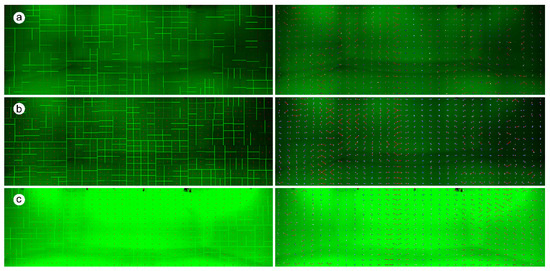 Images of the three steps process of correcting the cyclorama illumination: original configuration (a), first correction (b) and second correction (c). The images represent the 512 regions subdivision (left) and the centroid correspondence (right).