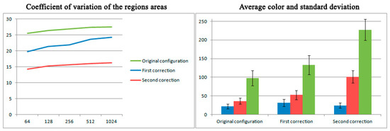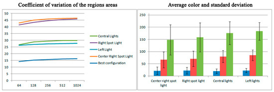 As it is expected, the statistical results are also very similar to the original configuration of the set, ranging from a coefficient of variation of 26.7% for 64 regions to a 29.9% for the 1024 configuration. The three color channels keep the proportions (Figure 13). The coefficient of variation is reduced with respect to the spot light tests as the artifact introduced is much subtler. The centroid average distance and coefficient of variation is also very similar to the one showed in the original configuration (Figure 12). This confirms the usefulness of the visual approach of the proposed calibration process, since apparently similar images have a correspondence of similar statistical results.