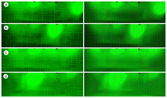 Images of the four tests performed: right spot light (a), center right spot light (b), center light (c) and left light (d). The images represent the 512 regions subdivision (left) and the centroid correspondence (right).