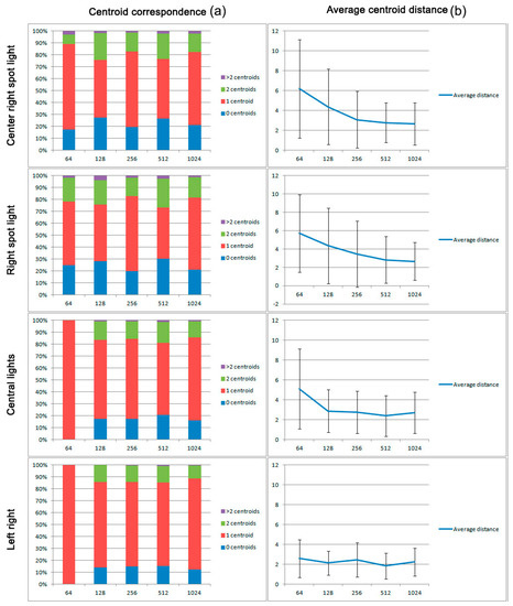 The second artifact consisted on using the same spot light but introducing a more centered distortion in order to check the impact of the residual light around this area in the final result and the importance of the light artifact location with respect to the results obtained. As it can be seen in Figure 11c, the visual result is very similar to the previous one, with many small regions concentrated in the spot light, and bigger areas in the rest of the image. The behavior of the centroid correspondence is also very similar (Figure 12).