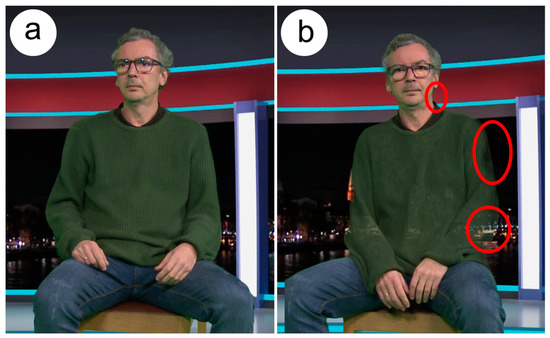 Composite image using a proper cyclorama calibration. Note the defined edges of the actor’s green jersey and the absence of artifacts on the composition (a). Composite image with a non-homogeneous background lighting (b). Note the transparencies in the green jersey, the blurred edges and the halos appearing in the neck of the actor. Modifying the chroma-keying threshold in order to reduce the undesired transparencies increases the halos and makes different artifacts appear in the background due to the illumination differences in the cyclorama.