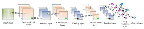 The convolutional neural network (CNN) was proposed by Fukushima [25] in 1980 and revised by LeCun [26]. In recent years, CNN has shown outstanding performance in natural language processing [27], disaster discovery [28], synthetic biomedicine [29], optical fiber communication [30], holographic image reconstruction [31], artificial intelligence program of go [32] and so on. With the advent of the era of big data, it is possible to train complex models with large-scale datasets on high-performance computing platforms (such as high-performance computers, graphics workstations, cloud computing platforms, etc.). In this context, many convolution neural network models have been proposed, such as LeNet [33], AlexNet [34], Overfeat model [35], VGGNet [36], GoogleNet [37], SPPNet [38], ResNet [39], MobileNets [40], ZFNet [41], DenseNet [42], and so on. CNN is a multi-layer network structure, whose basic structure mainly includes input layer, convolutional layer, pooling layer, fully connected layer, and output layer, as shown in Figure 1. The following are introduced in details.