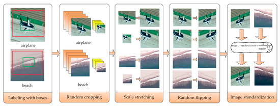 In fact, in order to solve the problem of limited labeled data in the field of high-resolution remote sensing image scene classification, many dataset amplification methods have been proposed. Different from the method of cutting the four corners and the center of the images to increase the number of labeled data proposed in [43], the basic idea of the multi-view scaling strategy proposed in this paper is to randomly cut the training data of high-resolution remote sensing image into different sizes and then stretch them. The specific steps are shown in Figure 4.