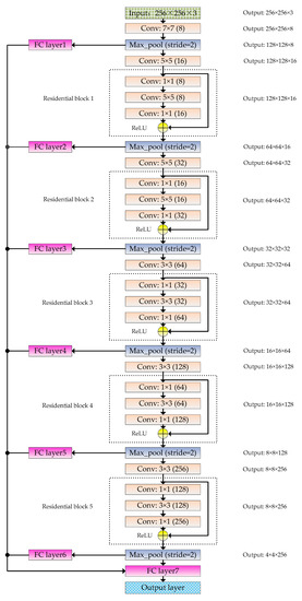 There are two kinds of typical structures of the residual block named 2-layer residual block and 3-layer residual block, as shown in Figure 7. In the 2-layer residual block, the input of the kth layer is connected with the output of k+2th layer by shortcut connection, and their vector addition result is taken as the input of k+3th layer. Since only vectors with the same dimension can be added, the dimensions of feature maps are reduced and increased in the 3-layer residual block by two 1 × 1 convolutional kernels.