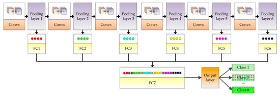 Although the pooling layer has the effect of characteristic invariance and dimension reduction, dimension reduction will lead to the loss of useful information and the detail information will be ignored. Based on this problem, this paper proposes the fusion strategy of pooling layer feature maps, as shown in Figure 8. The features in each pooling layer are expanded into a one-dimensional vector through a fully connected layer. Features are then cascaded through the final fully connected layer. Finally, classification is carried out through the output layer. This strategy can make the semantic information contained in different pooling layers complement each other and retain the details, thus improving the classification accuracy.
