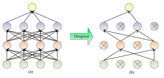 The basic principle of Dropout is to lose part of hidden layer neurons each time, which is equivalent to training on different networks each time, thus effectively reducing the interdependence between neurons, as shown in Figure 9. By adding the Dropout strategy, the calculation method of forwarding propagation changes from Equation (1) into Equation (17).