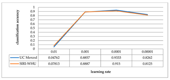 In this paper, the Adam optimization algorithm is adopted to carry out gradient descent, which required the setting of learning rate. Learning rate determines how far the weights will move in the gradient direction in a batch. If the learning rate is very low, the optimization time will become very long. On the contrary, if the learning rate is high, the training may not converge. In order to test the influence of different learning rates on the classification accuracy of RFPNet, experiments were carried out on the UC Merced dataset and the SIRI-WHU dataset respectively. With other parameters of RFPNet network unchanged, the learning rate is adjusted to 0.01, 0.001, 0.0001, and 0.00001, as shown in Figure 16. The trend of the UC Merced dataset’s accuracy is roughly the same as that of the SIRI-WHU dataset. When the learning rate is set to 0.01, the classification results of the two datasets diverge. When the learning rate is 0.0001, the training accuracy reaches the best result, and when the learning rate is 0.00001, it is in a declining trend.