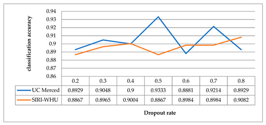 In the Dropout strategy, the Dropout rate p is the probability for one neuron to be discarded, and the probability to be retained is 1-p. The larger p is, the more features will be discarded during feature selection. The Dropout rates ranging from 0.2 to 0.8 were trained on the UC Merced dataset and the SIRI-WHU dataset respectively under the condition of keeping other parameters unchanged. The experimental results are shown in Figure 17. It can be seen that the classification accuracy of UC Merced dataset is the highest when the Dropout rate is 0.5. For the SIRI-WHU dataset, the classification accuracy is optimal when the Dropout rate is 0.8. It indicates that the optimal Dropout rate may not be the same when using the same model and different datasets.