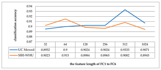 The main function of the fully connected layer is to map the learned representation of features into the sample tag space. Increasing the feature length of the fully connected layer is equivalent to increasing the number of neurons, which can theoretically improve the learning ability of the model. However, if the feature length of the fully connected layer is too long, which, on one hand, will make the learning ability too strong and lead to overfitting, on the other hand, will increase the operation time and reduce the efficiency. In order to test the influence of feature length on classification accuracy, the feature length of the fully connected layers from FC1 to FC6 is set as exponential multiples of 32, 64, 128, 256, 512, 1024 with other parameters unchanged, as shown in Figure 18. When the feature length from FC1 to FC6 is 512, the classification accuracy is the highest on UCM dataset. For the SIRI-WHU dataset, when the feature length from FC1 to FC6 is 64, the convolutional neural network has the best feature expression ability.
