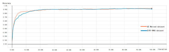 The concept of iteration is the process of training once with a batch of samples. In order to analyze the influence of different training iterations on test results, the corresponding experiments were carried out. As shown in Figure 19, the accuracy of both the UC Merced dataset and SIRI dataset has not changed significantly after about 25,000 iterations, and the accuracy then increases slowly, steadily, and slightly. In the paper, with the adoption of the residual block, there is no gradient explosion or gradient disappearance in the testing process, which indicates the advantages of the proposed method again.