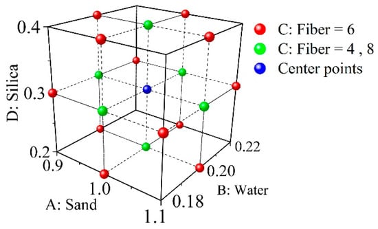 Basalt fiber is a kind of environment-friendly material made of natural basalt ore []. In recent years, basalt fiber has been widely used in the reinforcement of concrete materials due to its excellent performance of mechanical characteristics, corrosion resistance, high temperature resistance and electrical insulation [,]. It has been confirmed that the enhancing effect of 12 kg/m³ basalt fiber on the strength of concrete is similar to that of 40 kg/m³ steel fiber under the action of bending and impact load []. For the 28-day compressive strength of ordinary concrete, the optimal content of 12 mm long basalt fiber is 4 kg/m³ and the optimal content of 36 mm long is 8 kg/m³ []. Since basalt fiber performs well in the strength enhancement of ordinary concrete, researchers then apply it to UHPC. Tehmina Ayub et al. [] reported that when silica fume and kaolin were used instead of 10% cement in UHPC, the highest compressive strength of 84.08 MPa could be obtained at a volume content of 2% basalt fiber. Dehong Wang et al. [] investigated that the compressive and flexural strength of UHPC could be increased by 14% and 22.8% respectively under the synergetic effect of basalt fiber and polypropylene fiber. However, there are seldom research on adding basalt fiber into RPC as reinforcing material, and most studies take fiber content as a single factor variable. The systematic analysis of the interaction between RPC mix parameters and basalt fiber has not been carried out. Realizing this issue, the goal of this work is to characterize the influence of multiple mix factors and basalt fiber interaction on RPC properties, and provide reference for the mix design methods of basalt fiber reactive powder concrete (BFRPC). In this study, the relationship between four process variables (sand binder ratio, water binder ratio, basalt fiber volume and silica fume to cement ratio) along with workability and mechanical properties of BFRPC were modeled using the response surface method (RSM) []. Based on the established models, the influence degree and rule of process variables on material fluidity, flexural strength and compressive strength were determined.