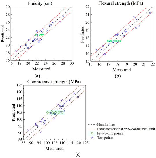 The predicted and measured values of fluidity, flexural strength and compressive strength for 29 experimental groups are shown in Figure 2. The green dots represent five central points. The error lines are drawn according to the estimated error value of the 95% confidence interval listed in Table 8. Points above the identity line (line of equality between predicted and measured values) indicated that the predicted value was larger than the measured value, while the points below the identity line indicated that the predicted value was less than measured value. As the distribution of data points was mostly within the 95% confidence interval band, it can be seen that the statistical model was of good accuracy.