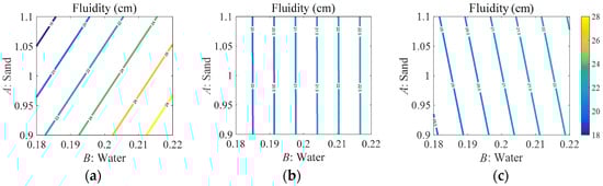 Meanwhile, there were interactions of BD and AD. By controlling D as a variable, three contour plots of AB could be obtained as Figure 3 shows. It was observed that the influence of A and B on fluidity was linear, but the linear trend gradually changed with the variation of silica fume content (D). As shown in Figure 3a, when the silica fume content (D) was less than 0.38, a decrease of the sand/binder ratio (A) led to an increase of fluidity values. As the critical point, when silica fume content (D) approached 0.38, the fluidity of the mixture would no longer be affected by the sand volume (A; Figure 3b). When the silica fume content was greater than 0.38, the fluidity of the mixture improved with the increase of the sand volume (A) as illustrated in Figure 3c. Meanwhile, with the increase of D, the fluidity of the mixture presented an overall downward trend. The fluidity of mixture will affect the construction workability of concrete, but its mechanical properties should be considered comprehensively to carry out the mix design.