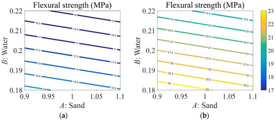 Contour plots of the s/b ratio (A) and w/b ratio (B) on flexural strength. (a) C = 0.225, D = 0.4 and (b) C = 0.3, D = 0.2.