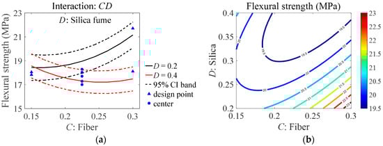 The interaction of CD is shown in Figure 5a, which indicates that the relationship between flexural strength and basalt fiber content (C) shows different changing tendency under different silica fume content (D). When D = 0.2, as shown in the black curve, with the increase of fiber content (C), the flexural strength of specimens also increased. When D = 0.4, as shown in the red curve, the relationship between flexural strength and fiber content (C) presents a negative quadratic curve. The maximum flexural strength was obtained at the two endpoints of the curve (i.e., when C = 0.15, D = 0.4 and C = 0.3, D = 0.2). However, it can be seen that the flexural strength at D = 0.4 was lower than that at D = 0.2, indicating that 0.2 was the optimal value of silica fume to cement ratio. Meanwhile, according to the trend of the curves, it could be judged that the strengthening effect of basalt fiber on RPC flexural strength was determined by the composition of cementitious materials. Based on the above conclusions, under the condition of A = 0.9 and B = 0.18, the contour diagram of CD and R2 is shown in Figure 5b. It can be found that the maximum flexural strength can be obtained when C = 0.3 and D = 0.2.