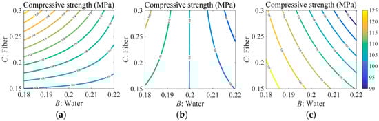 Refer to the above analysis, the contour diagram of compressive strength under the influence of BC is shown in Figure 7. Under the optimal conditions of A = 0.9 and D = 0.2, it can be seen from Figure 7a that the maximum compressive strength can be obtained when the fiber content C = 0.3, indicating that the addition of fiber plays a positive role in promoting the compressive strength of the specimen. When the silica fume to cement ratio reaches the critical value of 0.3 (Figure 7b), the water/binder ratio becomes the only effect of compressive strength, which shows an inverse proportional relationship. In the case of another optimal value (A = 1.1, D = 0.4, Figure 7c), the increase of fiber content causes a certain degree of loss in compressive strength, but it is not significant and remains at a high strength level.