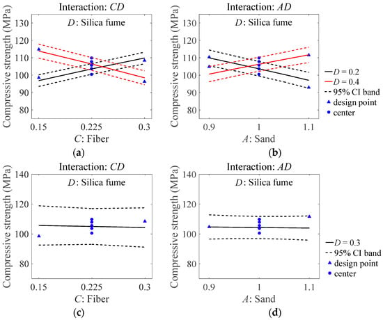 As significant model terms, the influence of CD and AD on the compressive strength of the specimen is shown in Figure 7. It can be seen from Figure 7a,b, the influence of the sand/binder ratio (A) and basalt fiber content (C) on the compressive strength presented different trends in the case of a change in silica fume/cement ratio (D). When D = 0.2, the compressive strength increased with the increase of fiber content and decreased with the increase of the quartz sand content. When D = 0.4, the compressive strength decreased with the increase of fiber content and increased with the increase of quartz sand content. Figure 7c,d shows that D = 0.3 is a critical value. Under this condition, the changes of A and C have only a small impact on the compressive strength. Silica fume and cement were components of cementitious materials, the ratio between them had an impact on the bonding performance of cementitious materials, aggregate and fiber, leading to the change of concrete density and thereby affecting the compressive strength of specimens. According to the comprehensive analysis of the above figures, the optimal compressive strength can be obtained when A = 0.9, D = 0.2 or A = 1.1, D = 0.4.