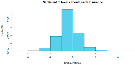 Fear was conveyed in Tweets about medical events such as “lose,” “disease,” “emergency,” “surgery,” “cancer,” and unanticipated costs. Consumers expressed both negative and positive sentiments about choice, but the NRC Emolex could not specify the exact emotion. For example, one tweet stated: “I hate choice so much that I’ve essentially disregarded my doctor because I’ve had such a low care of my own wellbeing.” It also identified “pressure” as being negative but could not specify what kind of emotion consumers expressed. Overall, the sentiment of consumers toward health insurance was slightly negative, although most sentiments were not at either extreme (Figure 2).