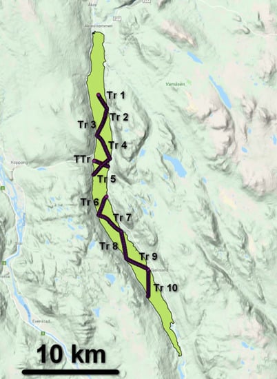 Map of Lake Storsjøen with transects Tr 1–10 recorded in May 2016, and the test transect TTr where six transects were performed to test the effects of the ping repetition frequency (PRF) and pulse duration (PD) on density estimates, in September 2017.