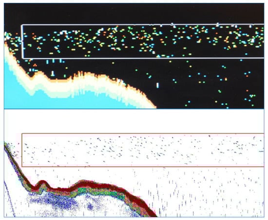 Echograms from Transect 2, 27.05.2016, produced by Simrad EY-M/HADAS (above) and by Simrad EK15/Sonar5-Pro (below). Horizontal lines show 20–47 m depth and cover an approximately 1000 m stretch (vertical spots at depths > 50 m the in the lower chart are due to noise, not fish).