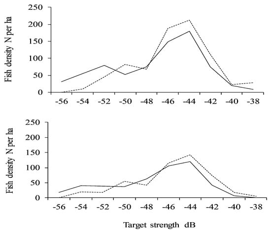 - Jurvelius, J.; Marjomäki, T.J.; Peltonen, H.; Degtev, A.; Bergstrand, E.; Enderlein, O.; Auvinen, H. Fish density and target strength distribution of single fish echoes in varying light conditions with single and split beam echosounding and trawling. Hydrobiologia 2016, 780, 113–124. [Google Scholar] [CrossRef]