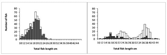 (left): Total length frequency distribution of smelt and (right): whitefish caught in benthic nets (filled columns) and pelagic nets (open columns)