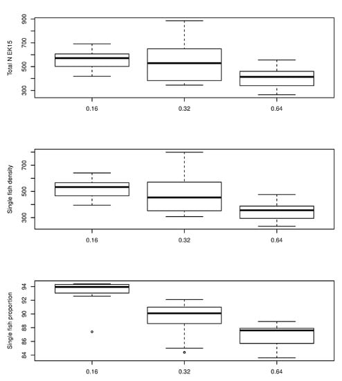 Bloxplots (bold horizontal line = median, box showing 25 and 75 percentiles, whiskers show min - max) showing EK15-based estimates of the total density (above), single fish density (middle) and proportion of single fish plotted against tree different pulse durations (below).