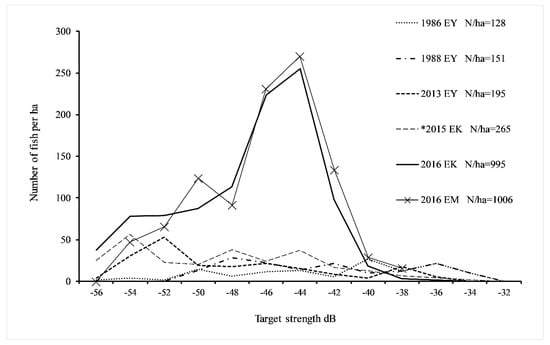 The test recordings in September 2017 showed that the fish moved higher in the water column in the afternoon, probably to feed on plankton at night. The recordings at daytime in May, may be assumed comparable across years, and the estimates of 1986, 1988 and 2013 were rather similar, with the exception of the appearance of TS < −50 dB in 2013, probably due to the occurrence of smelt, as one-year old whitefish are about 10 cm of length [], giving slightly stronger echoes (≈−48 dB). The bimodal length distribution in the fish samples from 2015, with smelt contributing most to a peak between 12–20 cm length, and with a peak between 32–40 cm of whitefish suggested that the dramatic density increase was due to smelt.