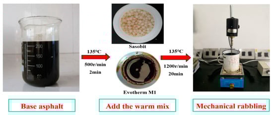 First, the origin asphalt was preheated in an oven at 135 °C for 1 h, and 500 g of neat asphalt was weighed. Second, the mass fractions of 0.5% Evotherm M1 warming agent and 3% Sasobit warming agent were mixed with a mixer at 500 r/min speed for 2 min. Finally, the mixture was stirred at a high speed at 135 °C and 1200 r/min for 20 min to prepare a warm asphalt. The specific process and parameters are shown in Figure 1.