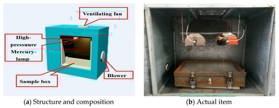 Selection and design of aging simulation systems. To simulate the aging of asphalt in outdoor UV conditions, an asphalt rotary film oven and a UV aging simulation system were selected for indoor accelerated asphalt UV aging. A high-pressure mercury lamp of model GYL230-220V-1000W is selected as the UV light source, its spectral range was 320–450 nm, and the main peak was 365 nm. It is an ideal light source for aging of UV polymer compounds. The self-designed UV aging simulation system consisted of two parts. The first part was the UV aging case, which included the UV aging box, air cooling system, UV lamp set, and temperature monitoring system. The second part was the UV aging sample part, which included the UV aging sample box and gas exchange system (Figure 2). The UV aging simulation system is suitable for asphalt light, light-heat, and light-heat-oxygen aging tests, the temperature can be controlled within the range of 60 °C~130 °C, and the UV intensity can be controlled between 50 and 600 w/m2.
