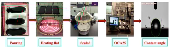 The contact angle preparation method and test are shown in Figure 3. First, the asphalt was heated in an oven at 135 °C for about 1 h. Then, 1.5 g of hot asphalt was poured onto the slide, the slide was placed on the heating rack, and the heating rack was adjusted to keep the heating plane level. The asphalt was heated to a temperature of about 135 °C for 20 min to obtain a smooth asphalt test surface. After the asphalt was heated, it was allowed to cool to room temperature, and then moved to a sealed dry container horizontally for 24 h to perform a contact angle test.