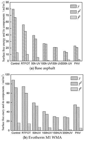 The SFE and its components of base asphalt, Evotherm M1 warm asphalt, and Sasobit warm asphalt before and after UV aging are shown in Figure 4. The SFE and its components of base asphalt and warm asphalt decreased after RTFOT aging. UV aging at different times and PAV aging decreased, but the extent of reduction was different. Compared with the base asphalt, the surface energy of the three asphalts decreased by 29.97%, 12.68%, and 39.84%, and the dispersion components decreased by 31.68%, 13.18%, and 36.20%, respectively. The polar components decreased by 21.11%, 9.82%, and 66.26%; after 200 h of UV aging, the surface energy decreased by 81.04%, 72.73%, and 81.53%, the dispersion components decreased by 80.21%, 69.97%, and 87.79%, and the polar components decreased by 85.33%, 88.38% and 89.32%, respectively. The surface energy after PAV aging and its component are between 50 h of UV aging and 100 h of UV aging. The reason for this is that the oxidative aging of asphalt causes the light components in the asphalt to undergo conversion to the heavy components through volatilization. The asphaltene content is significantly improved. Previous studies have shown that the higher the asphaltene content, the smaller the surface energy in the asphalt [32,33].