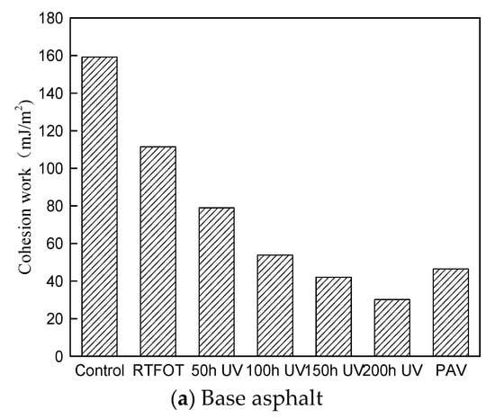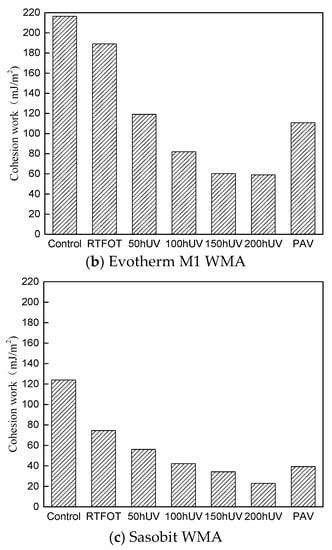 According to the description in Section 2, the cohesion work is numerically equal to two times the SFE value. Therefore, the cohesive work of asphalt is consistent with the change trend of SFE with the addition of Sasobit and Evotherm warming agent. That is, the cohesion work of the three kinds of asphalt gradually decreases with the aging time, and the cohesion work of Evotherm M1 WMA tends to be stable after 150 h of UV aging. The addition of the warming agent makes the viscosity of the asphalt change differently. Compared with the base asphalt, the cohesion work of the asphalt decreased by 22.19% after adding Sasobit. The difference is that the cohesion work of the asphalt increased by 36.04% after adding the Evotherm M1 warming agent. Compared with the cohesion work of the neat asphalt, after 200 h of UV aging, the cohesion work of Evotherm M1 WMA decreased from 216.52 to 59.05 mJ/m2 with a decrease of 72.73%. The cohesion work of Sasobit WMA decreased from 123.85 to 22.87 mJ/m2 with a decrease of 81.53%. After PAV aging, the cohesion work of Evotherm M1 WMA decreased to 110.79 with a decrease of 48.83%. The cohesion work of Sasobit warm asphalt decreased to 39.27 mJ/m2 with a decrease of 68.29%.