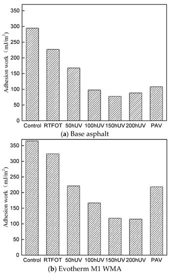 - UV aging leads to a decrease in the adhesion work and compatibility of the warm asphalt and limestone aggregates, an increase in the peeling work, and an overall deterioration of the adhesion properties. The adhesion work of matrix asphalt and Evotherm M1 warm asphalt after 150 h of UV aging tends to be stable, while the adhesion work and compatibility of Sasobit warm asphalt and limestone aggregates decrease first and then increase, reaching a minimum at 100 h of UV aging.