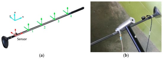 A discretized model is designed using OROS Modal software (OROS, Grenoble, France) in order to rebuild the modal shapes, and it comprises four segments three connected by five nodes. One node represents the three-axis observabilities recorded by a piezoelectric accelerometer (B&K4525, Bruel and Kjaer, Duluth, USA). The other four nodes stand for the three-axis controllabilities, i.e., twelve controllabilities. Excitation is performed using a shock hammer equipped with a force sensor (208C02, PCB Piezotronics, Buffalo, USA), as seen in Figure 2. Synchronous data collection is supplied by an OROS acquisition system (OR36, OROS, France).