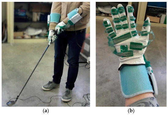 (a) Experimental modal analysis in grip-free boundary conditions. (b) Glove equipped with pressure sensors.